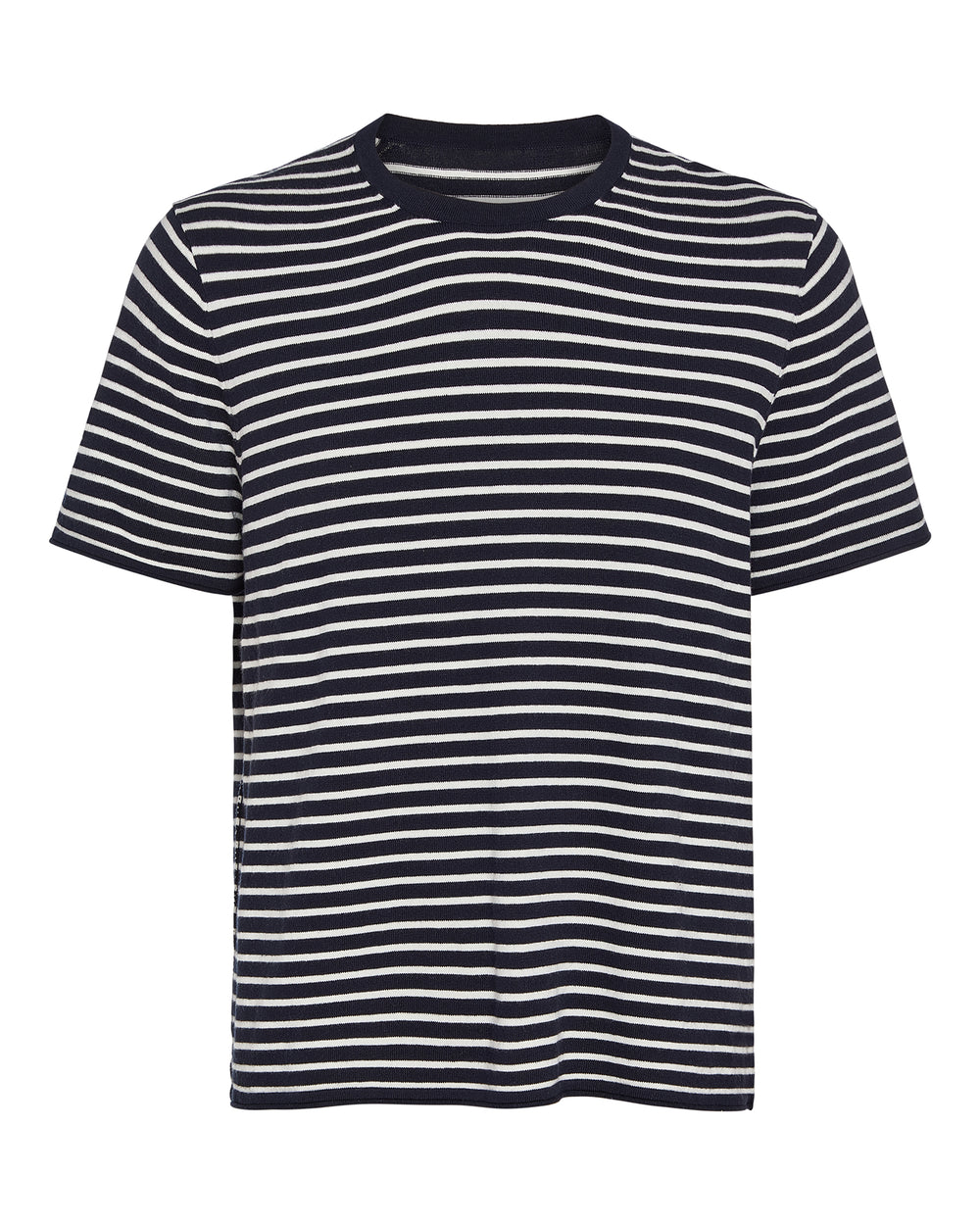 This Cotton Cashmere Crew Neck striped tee is the definition of laid back refinement. Crafted from a soft cotton-cashmere blend, it’s an elevated staple that is effortlessly cool and endlessly wearable. Your new go-to for understated style.