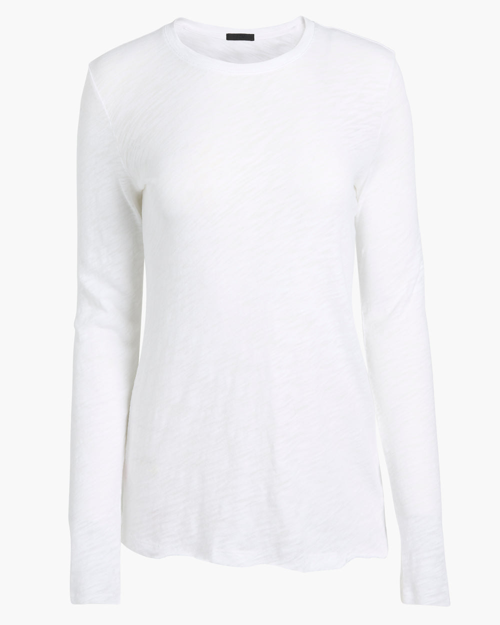 The Slub Jersey Long Sleeve Destroyed Wash Tee gets its texture from the uneven yarns of our unique Peruvian Cotton. It features a subtle scoop neck, imperfectly distressed hem and sleeve cuffs, and just the right amount of sheer. The loose weave of this heavier Cotton molds modestly to the body offering the perfect drape.