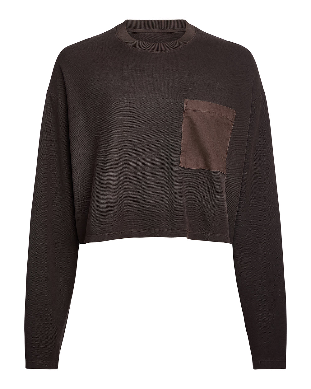 Crafted from 100% cotton with a luxuriously soft texture, this semi-cropped tee features a relaxed fit, oversized sleeves, drop shoulders, a refined crew neckline, and a contrasting front pocket. It seamlessly blends minimalist design with comfort and an elevated look.