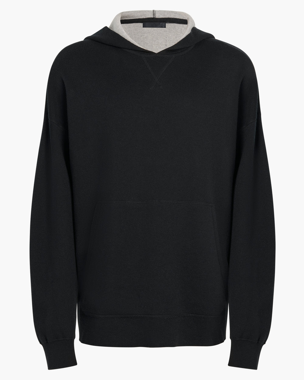 This two-tone plaited cashmere hoodie is the ultimate refined essential. Constructed from premium cashmere yarns, it delivers uncompromising craftsmanship, softness and warmth. This item features a double faced hood, classic crossover neck, and a pin stripe across the hood and sides giving a nod to sportswear. The thoughtfully designed details balance polish and ease, seamlessly elevating your everyday.