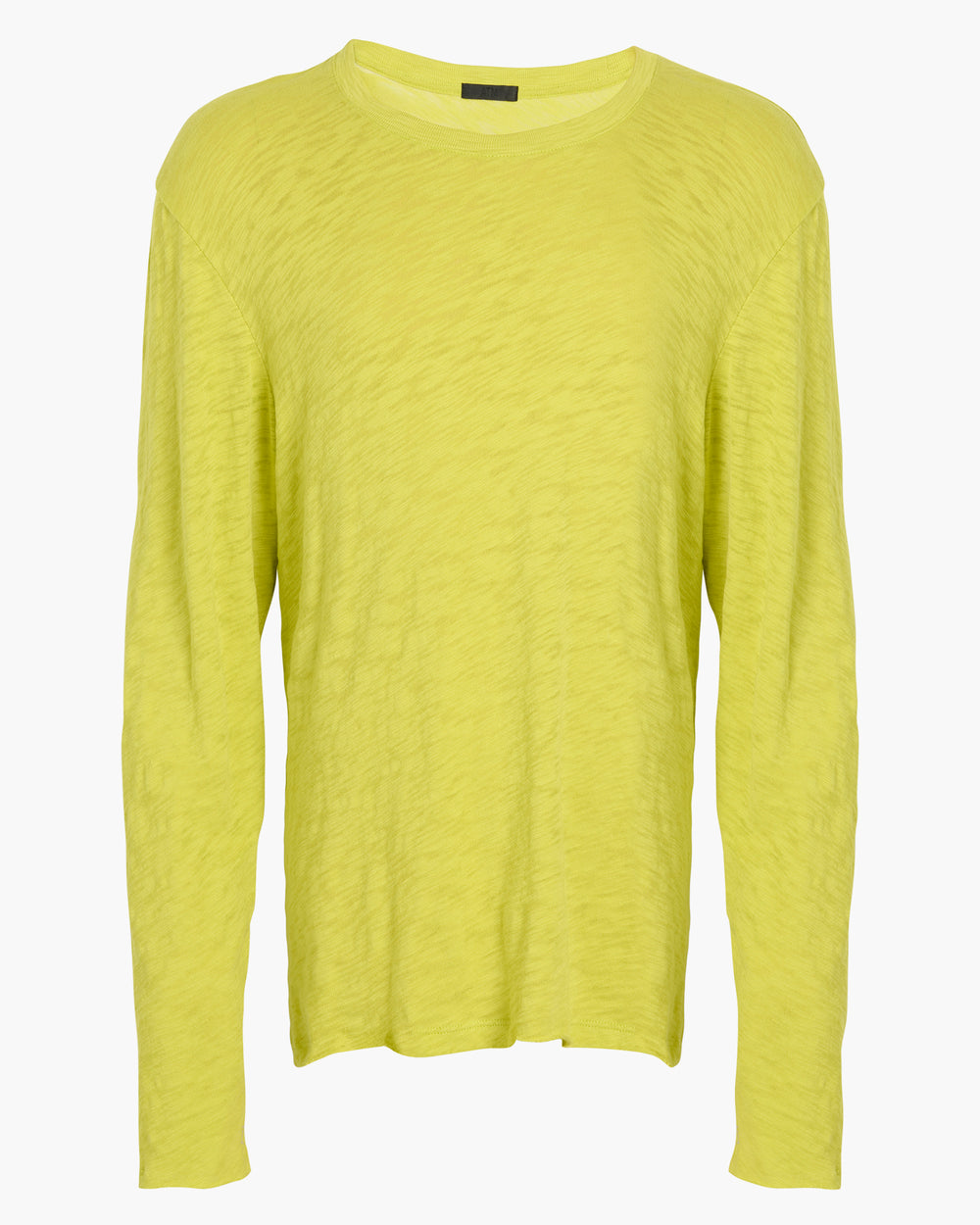 The Slub Jersey Long Sleeve Destroyed Wash Tee is one of creative director Tony Melillo's personal favorite pieces from the essential collection. The top-selling Slub Tee Fabric gets its texture from the uneven heavy yarns of our unique Peruvian Cotton. This Long Sleeve features a relaxed crew neck, distressed hem and sleeve cuffs, and a looser weave that offers the perfect drape.